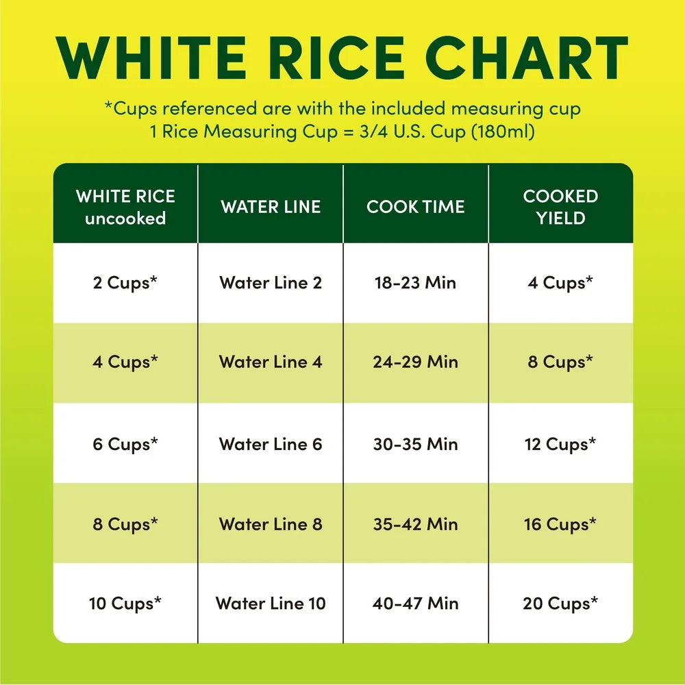 Prepare up to 20 cups (cooked) of fluffy rice and perfect grains