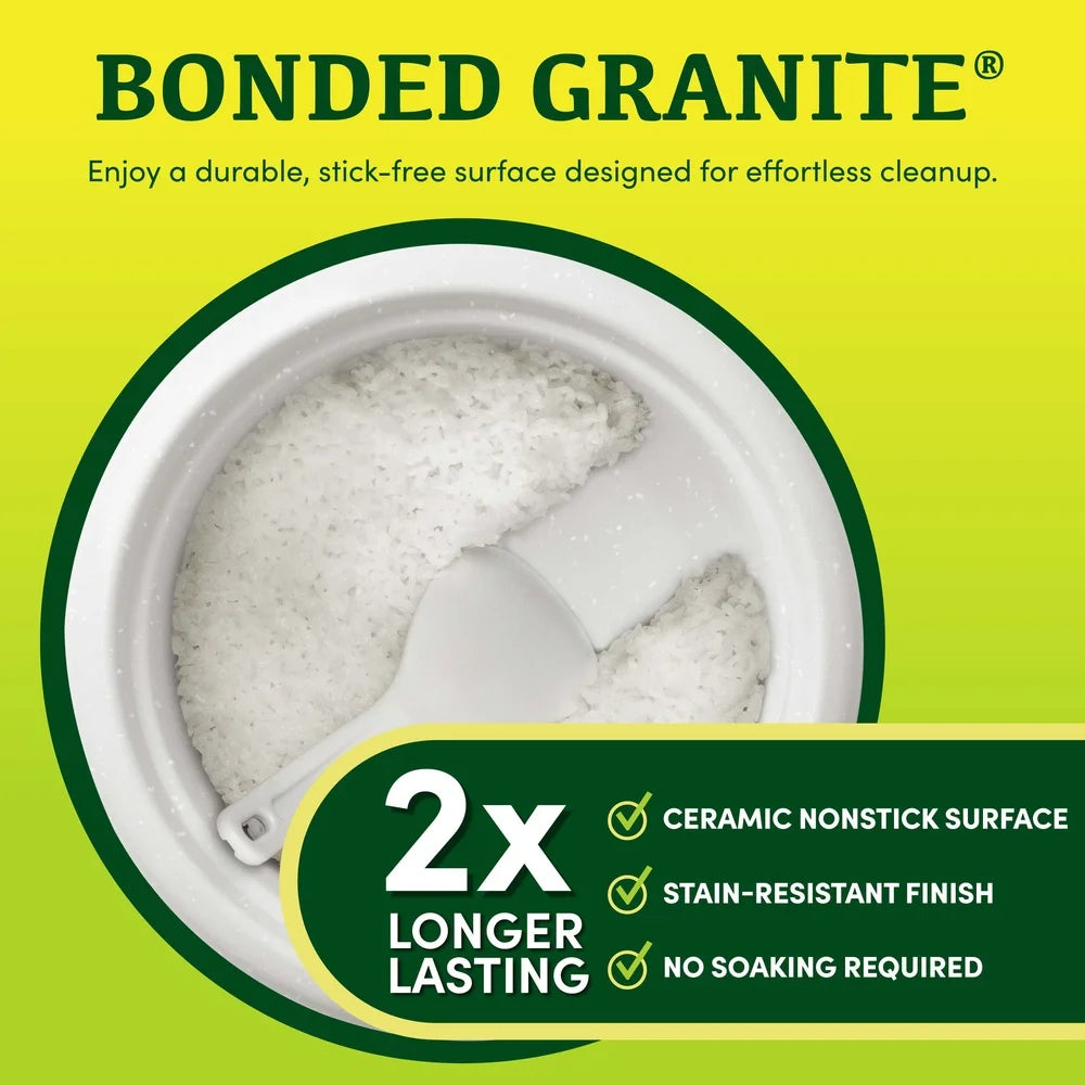 Stack it up for steaming, then nest it down for storage. Now you can steam meat, vegetables, and side dishes while grains cook below. The entire process is hands-free: start cooking with a touch, then it automatically switches to Warm! The naturally nonstick ceramic top layer prevents sticking and wipes clean with ease, and features a scratch-resistant finish that lasts 2x longer than traditional ceramic coatings.