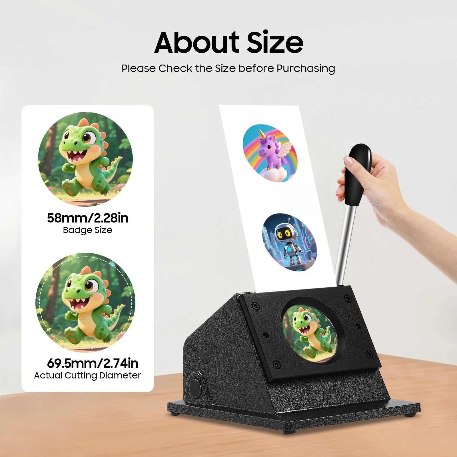 2. Our product is suitable for cutting circles with a diameter of 2.74in to make badges with a diameter of 2.28in, please check the size before purchasing.