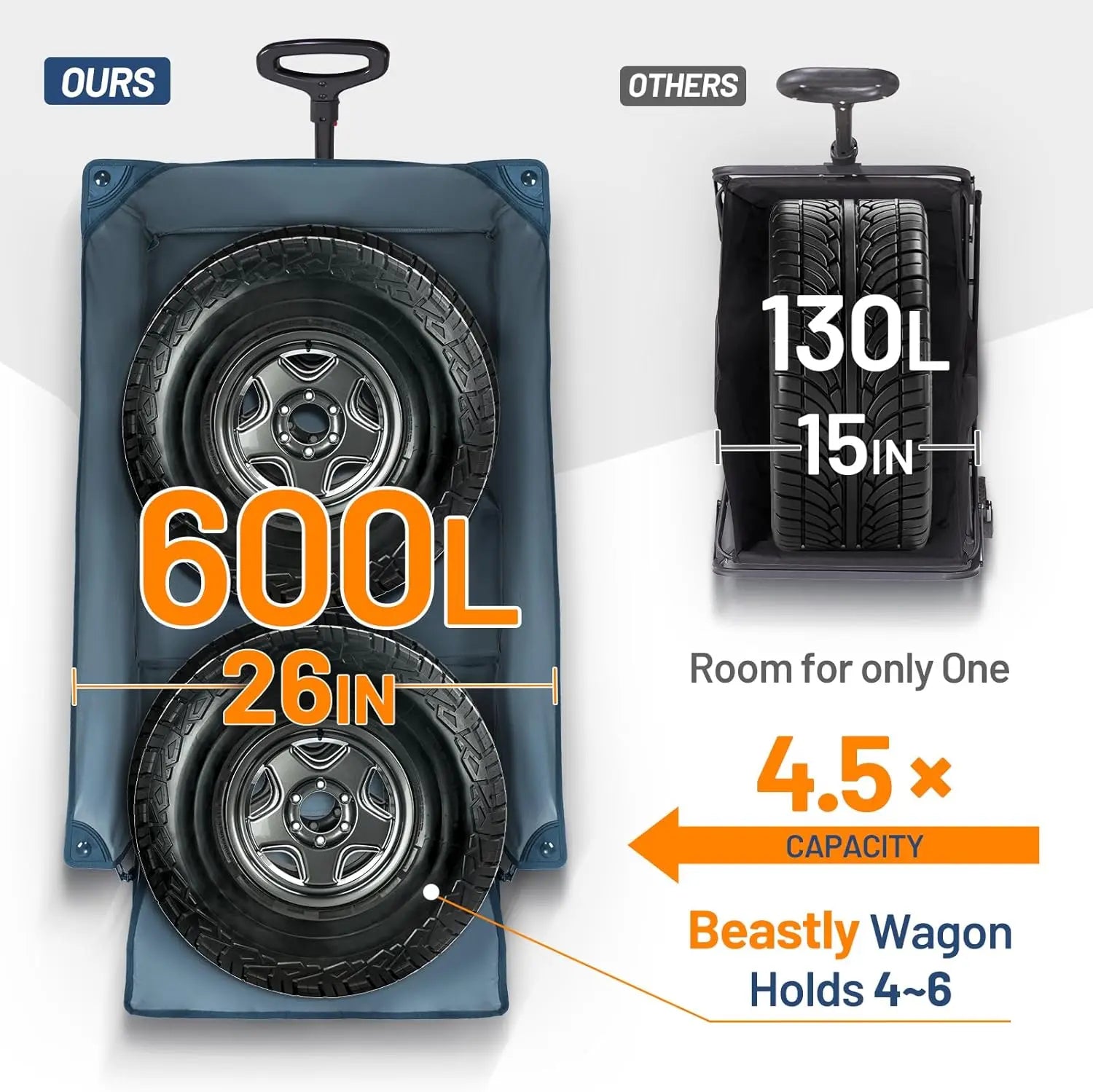 1. WIDER & LARGER CAPACITY: Our widened collapsible folding wagon measures 41.5 "L x 25.5 "W x 14 "H, providing more storage space than the regular wagon. Maximum storage capacity is 600L/11 cu.ft, 350% more than other products. The cart can hold up to 400 lbs. and comes with side pockets and mesh cup holders to hold all your outdoor gear at once. The included cargo net holds even more items for increased efficiency.