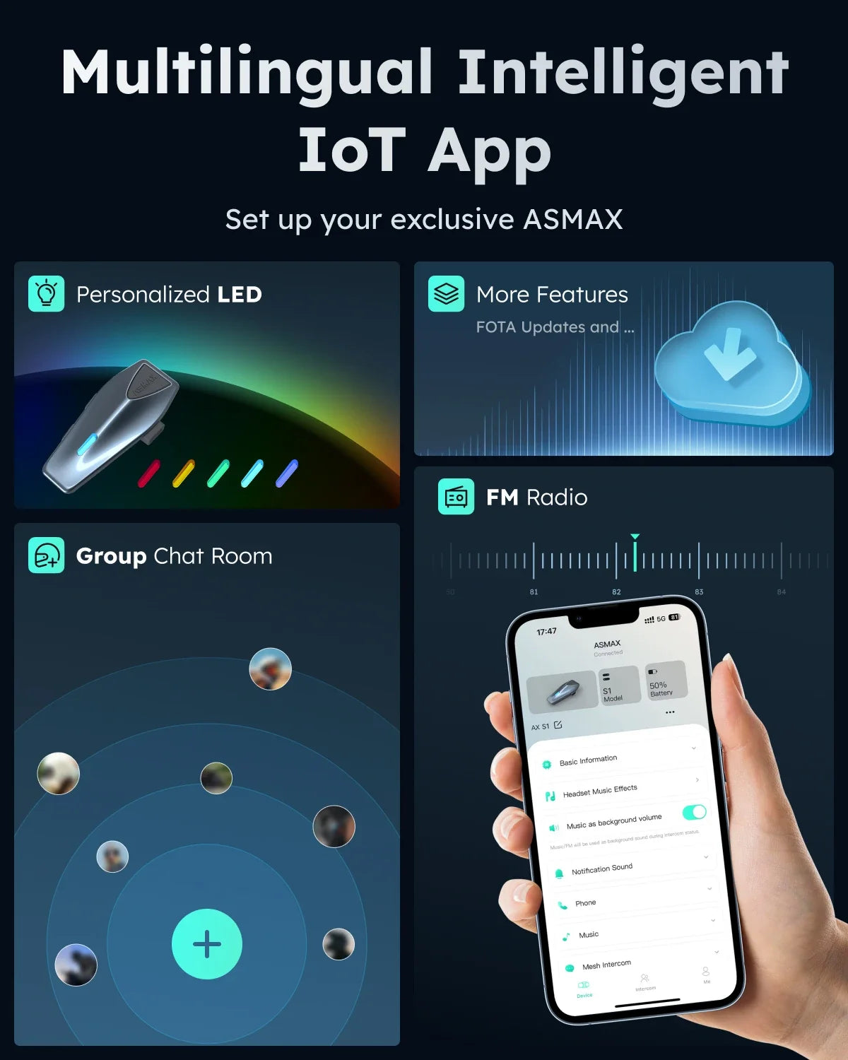 ASMAX S1 Helmet Intercom Global Version Motorcycle Mesh Group Intercom Voice Control Multi-audio Bluetooth Headset APP/IPX7/ENC/FM Radio