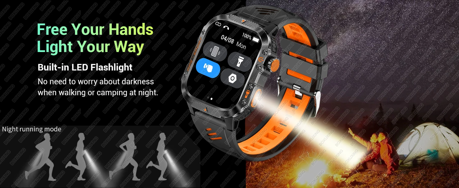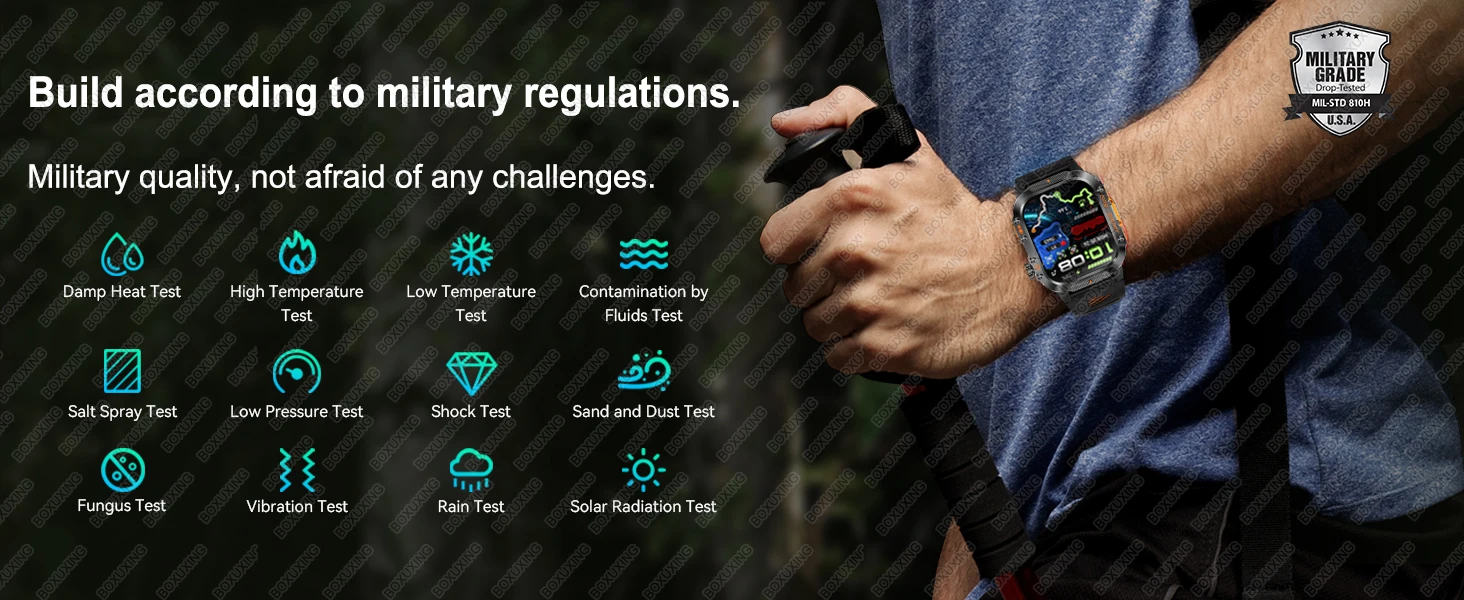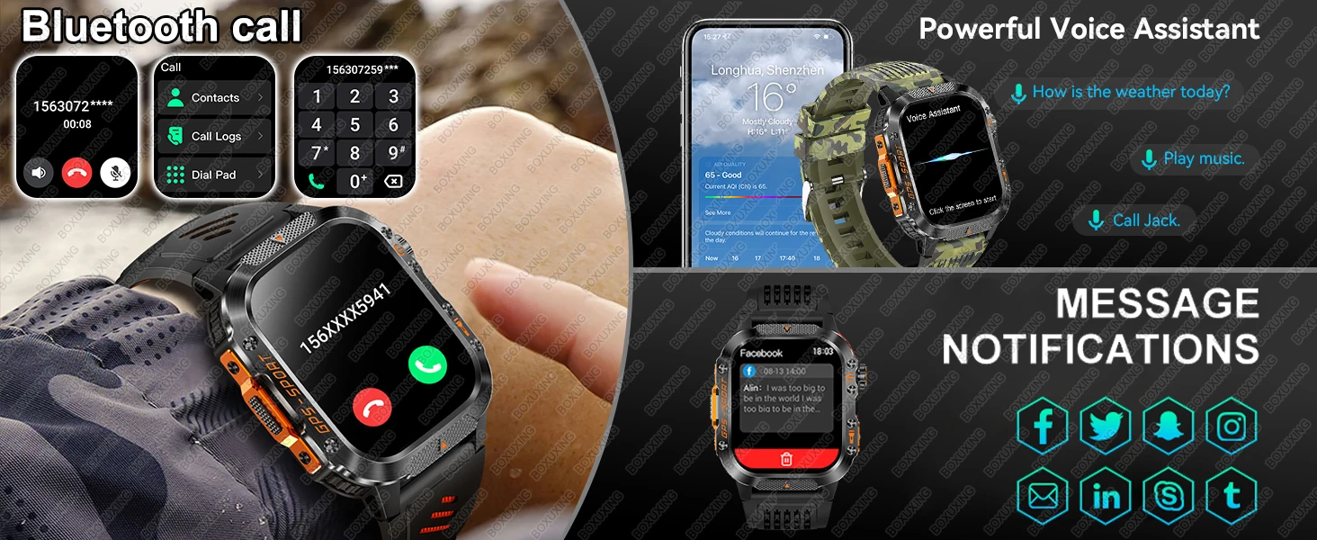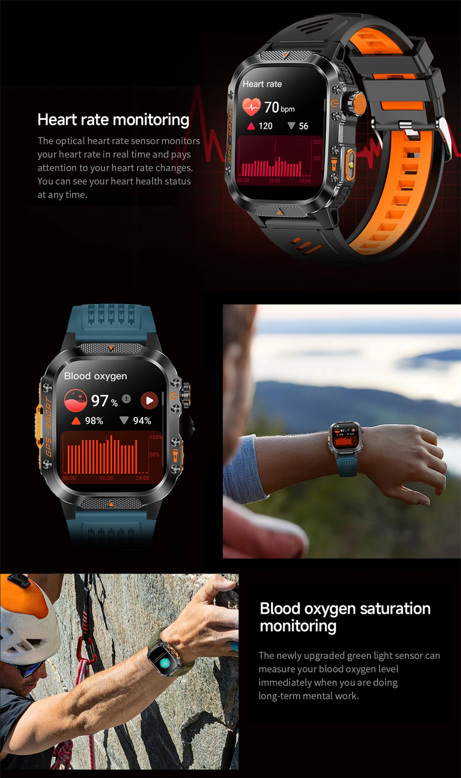 Military-grade high-quality materials: The body of this smart watch is made of high-quality materials, with a strong structure and a long service life. Passed various violence tests. Can withstand long wear and tear. And it is fully suitable for complex environments such as outdoors and construction sites.