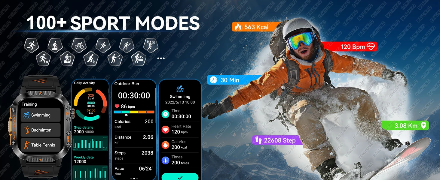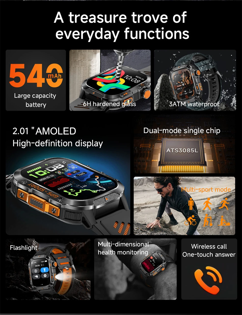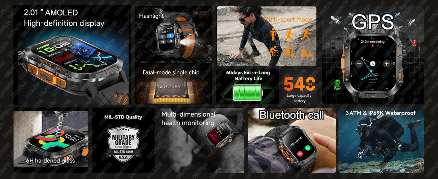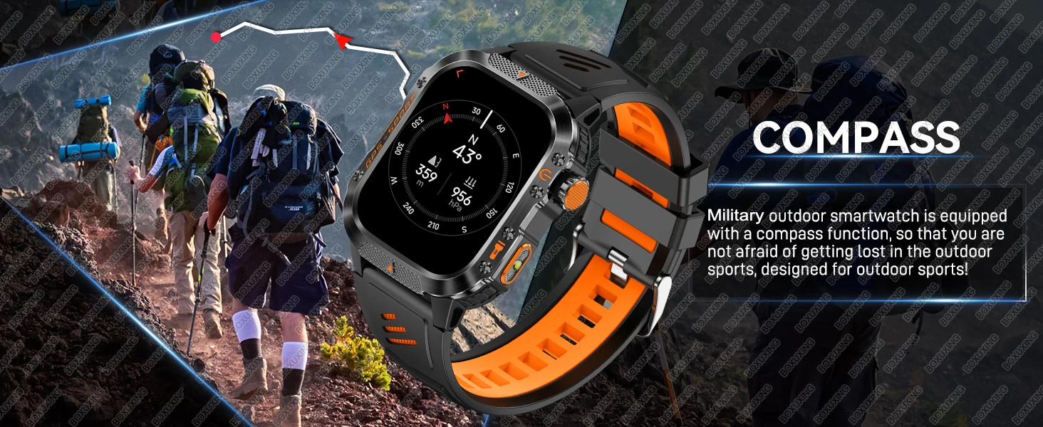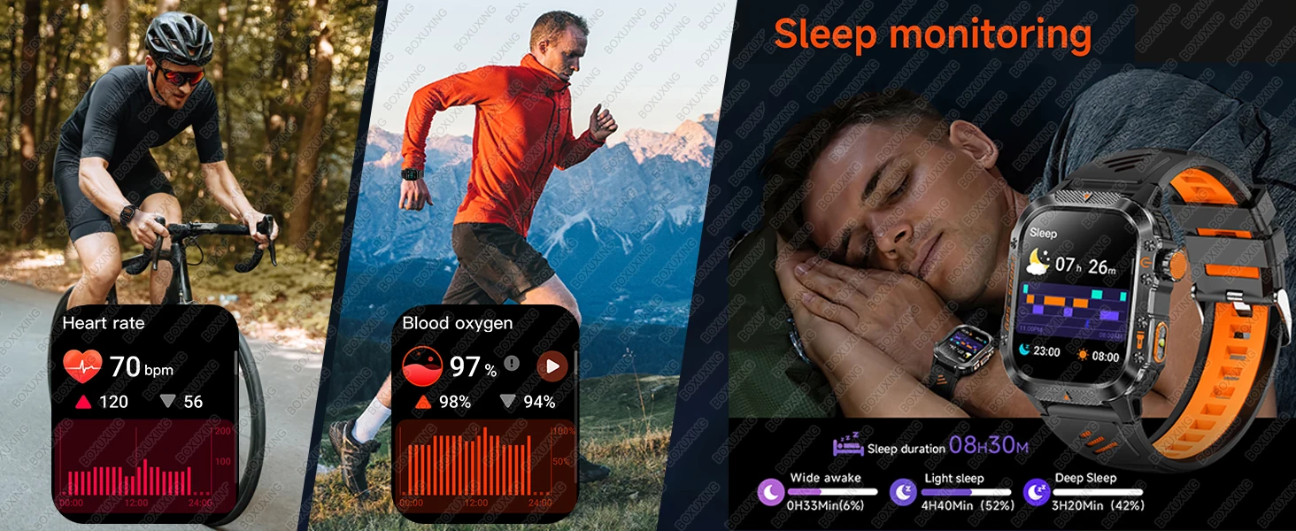 Military-grade high-quality materials: The body of this smart watch is made of high-quality materials, with a strong structure and a long service life. Passed various violence tests. Can withstand long wear and tear. And it is fully suitable for complex environments such as outdoors and construction sites.