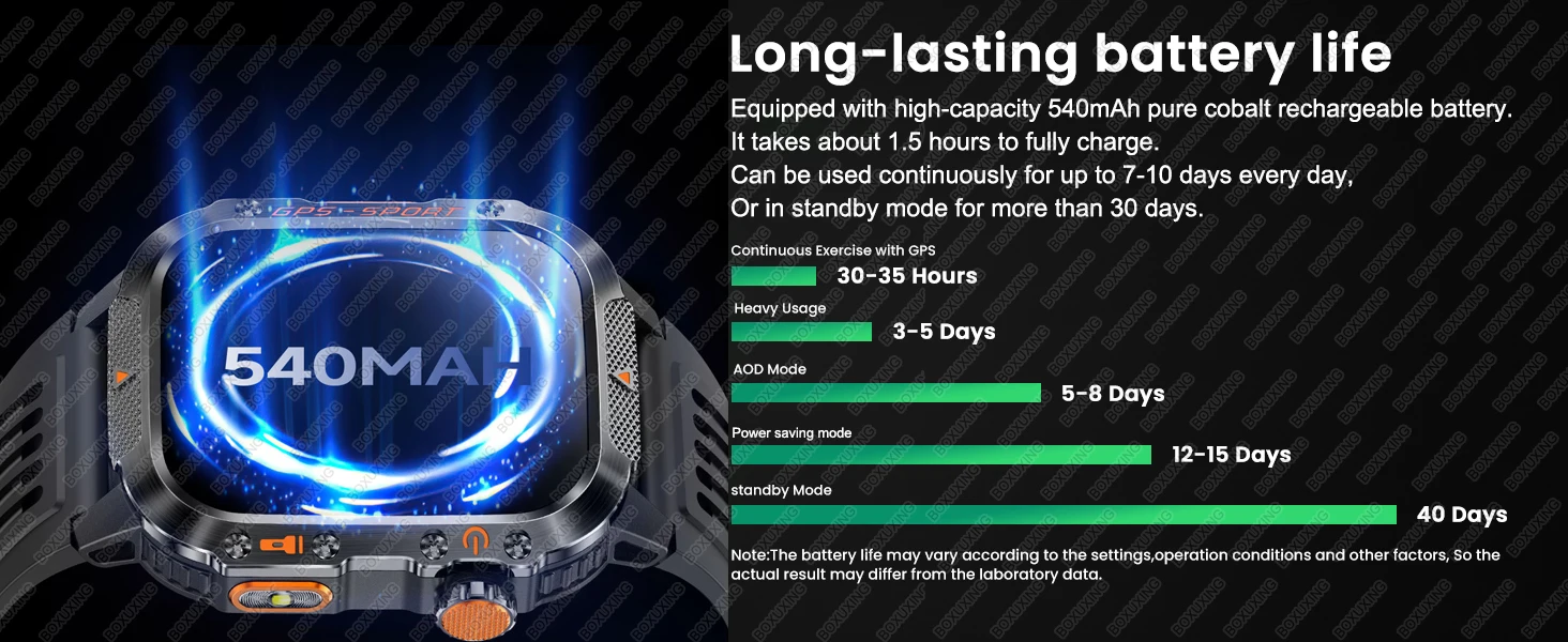 540mAh large-capacity battery: This smart watch is equipped with a 540mAh battery, with extremely strong battery life. Whether you are busy working for many days or sweating outdoors, the watch can ensure that it is constantly powered throughout the whole process. Stay in the best shape at all times.