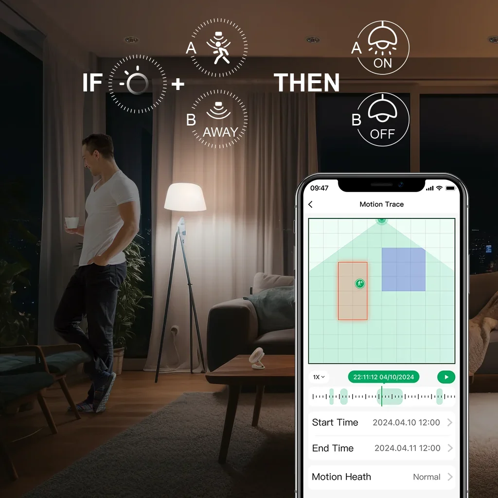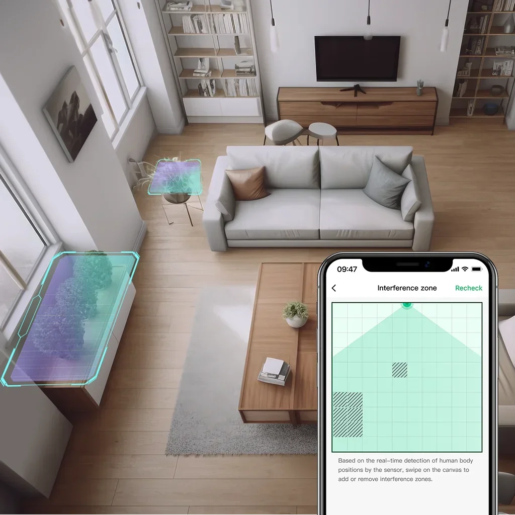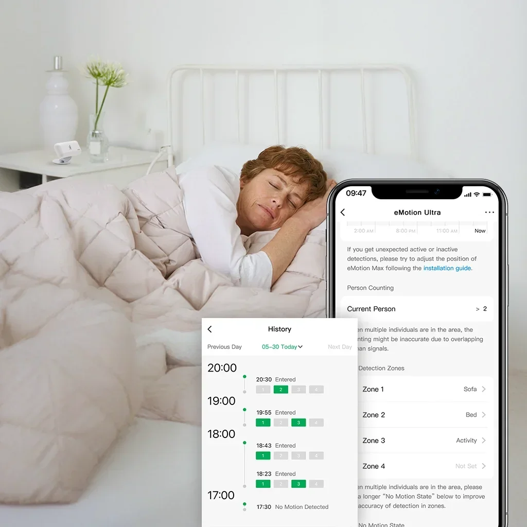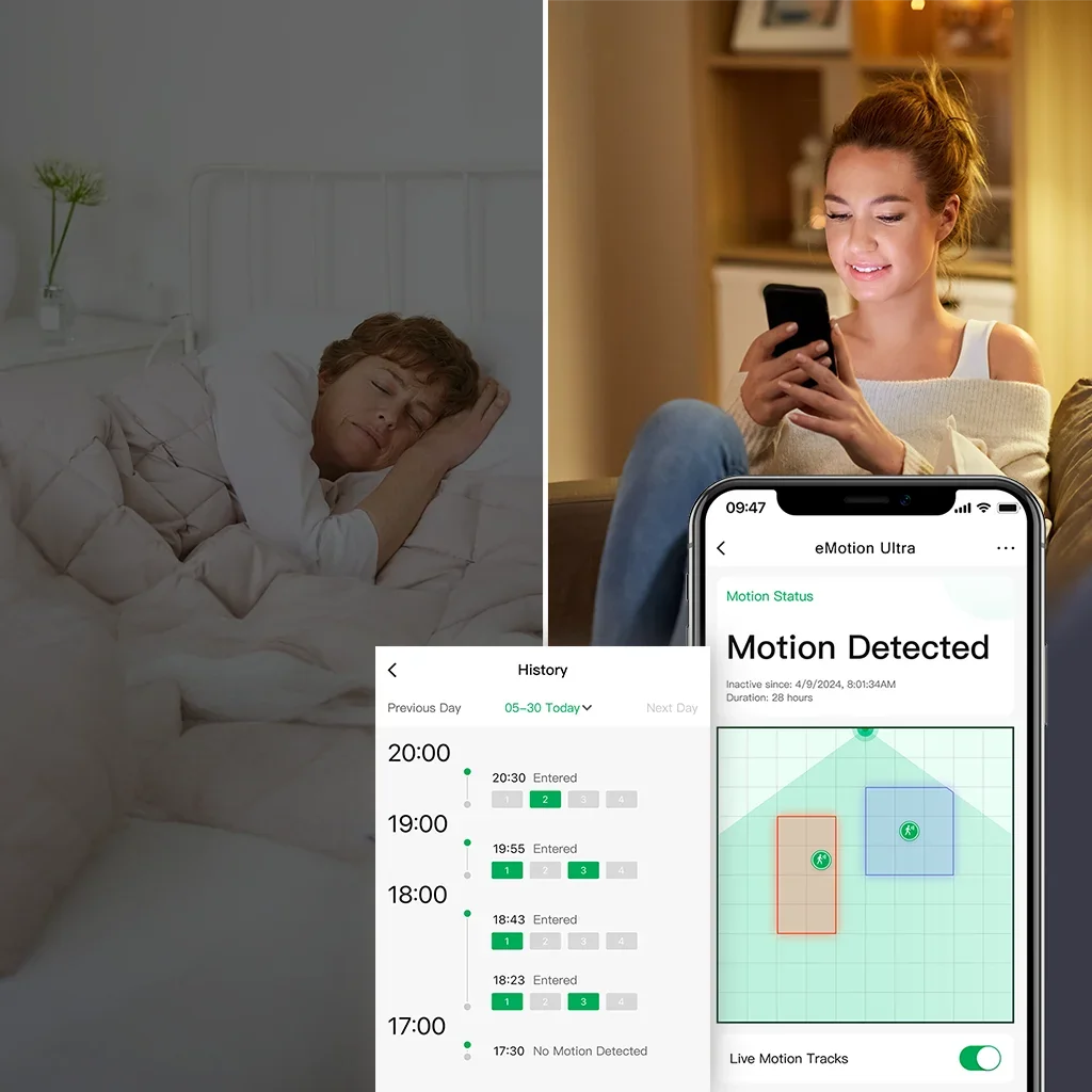 STATIONARY HUMAN DETECTION & ANTI-INTERFERENCE - Say goodbye to waving at outdated PIR motion sensors! Powered by advanced mmWave radar, eMotion Ultra detects even the slightest movements — like your heartbeat or breathing (facing front) — while you're sitting still or sleeping. Define in-app interference zones to exclude plants, curtains, or pets. Set a filtering height to ignore fan or pet movement.