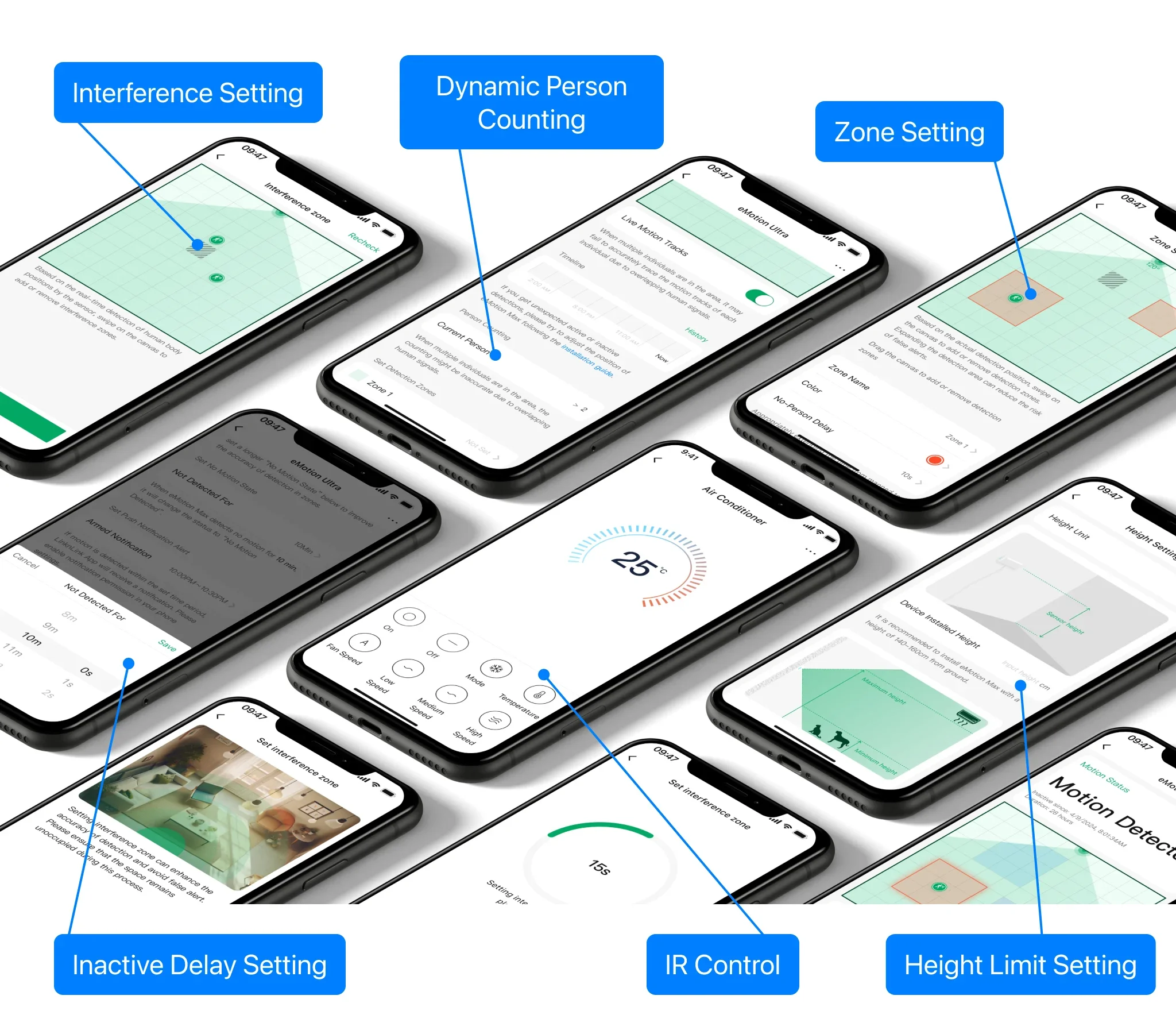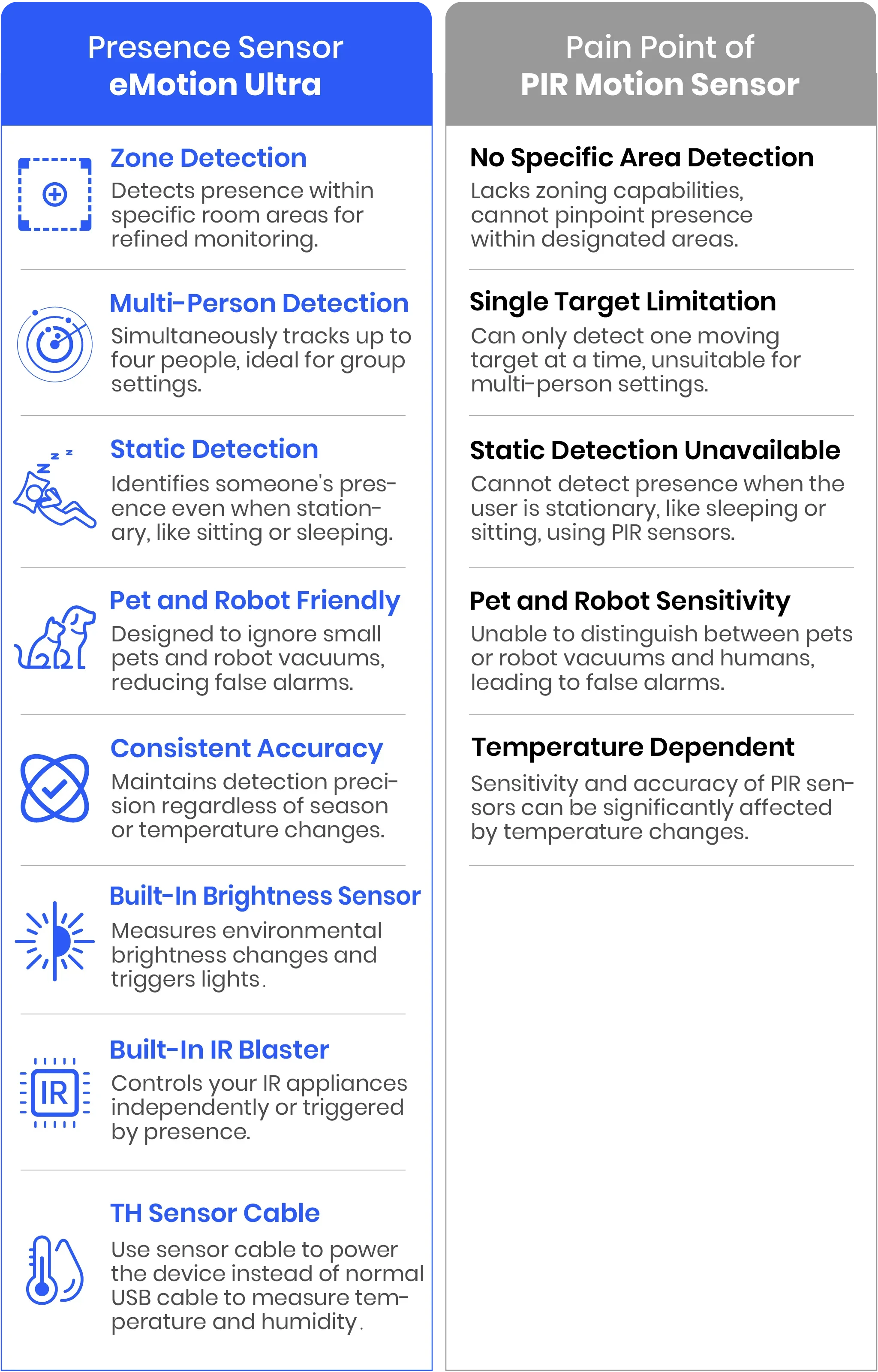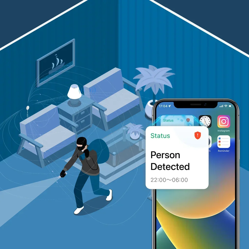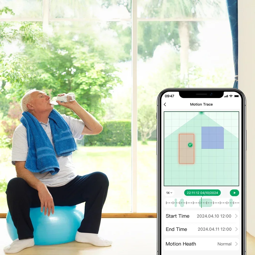 STATIONARY HUMAN DETECTION & ANTI-INTERFERENCE - Say goodbye to waving at outdated PIR motion sensors! Powered by advanced mmWave radar, eMotion Ultra detects even the slightest movements — like your heartbeat or breathing (facing front) — while you're sitting still or sleeping. Define in-app interference zones to exclude plants, curtains, or pets. Set a filtering height to ignore fan or pet movement.
