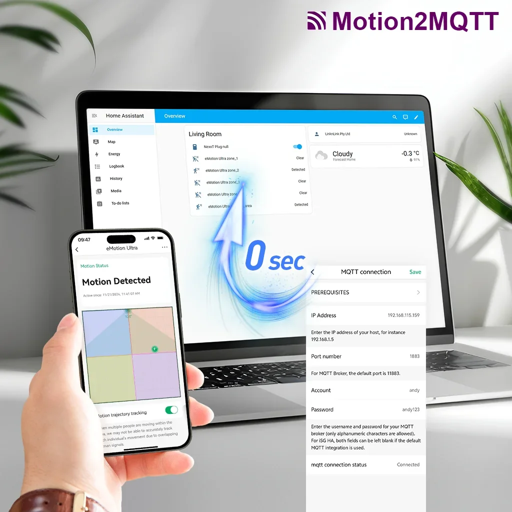 BLE HUB FOR EXTENDED ACCESSORIES - Connect and manage more devices with eMotion Ultra, which acts as a dedicated BLE hub for a wide range of LinknLink Bluetooth accessories: Contact sensors, Temperature and humidity sensors, Fingerbots, Curtain openers and Door locks. Supports max 20 BLE accessories and sync them with Home Assistant via MQTT.